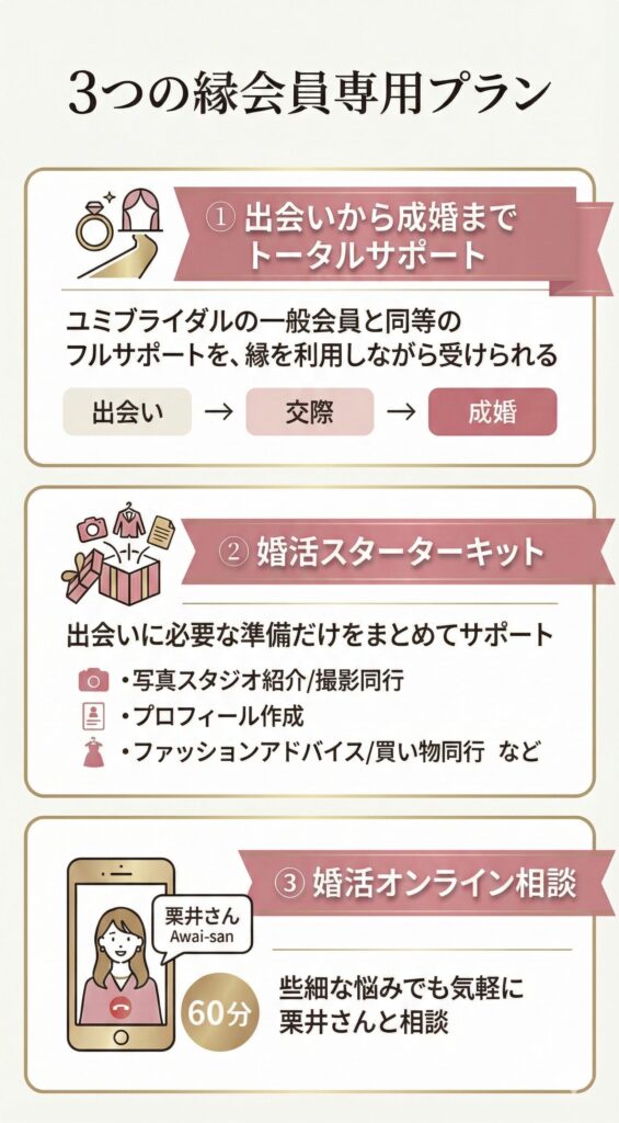 1人でも多くの皆様のお役に立てるよう、3種類の縁会員専用プランをご用意いただけることになりました。