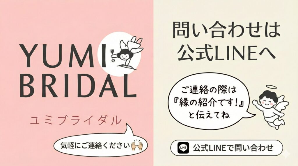 ご質問や申込みは、ユミブライダルへ直接お問い合わせください。(縁では回答できかねます)