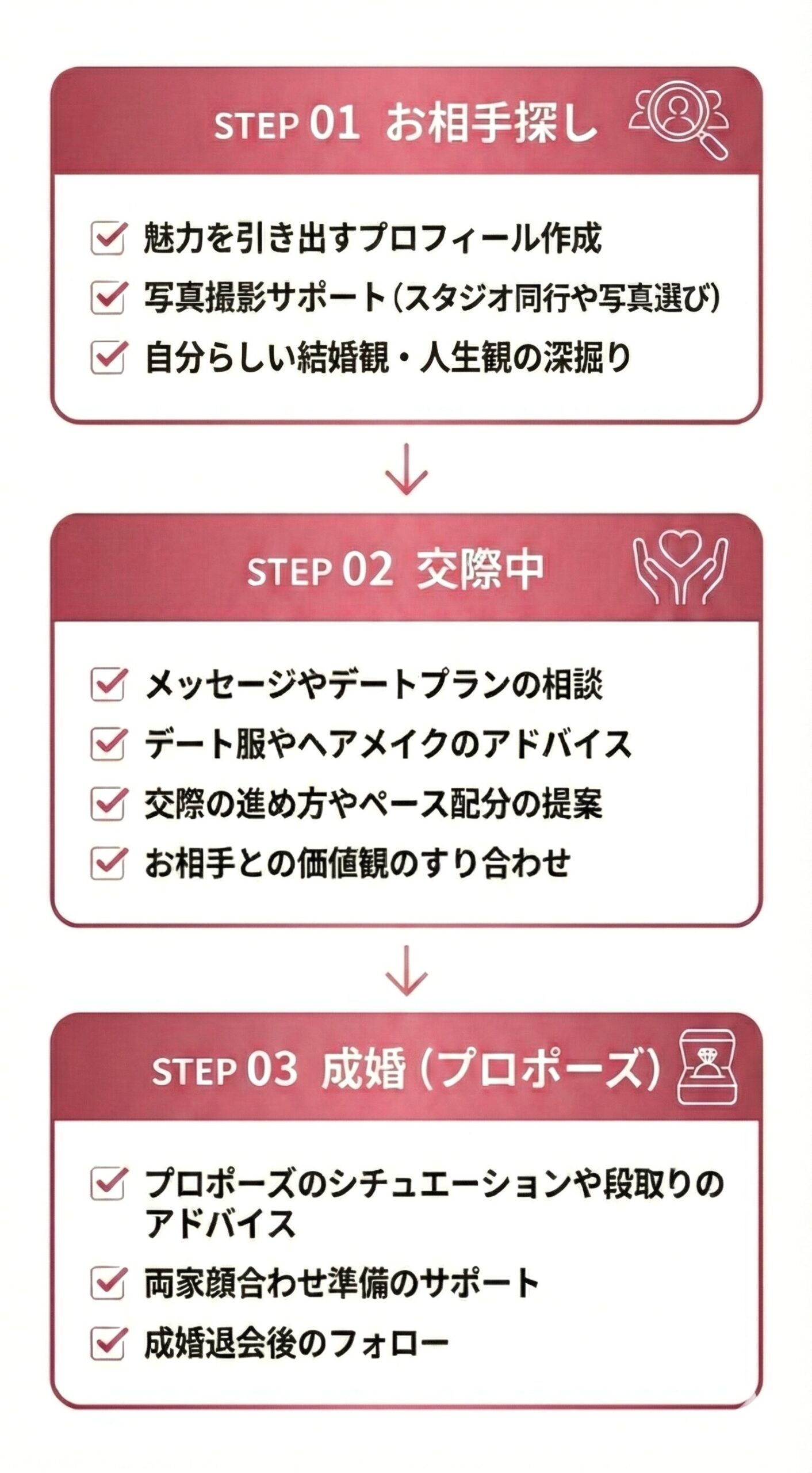 このように、すべてのステップでプロのサポートが受けられる。これがアプリにはない相談所だけの強みです。